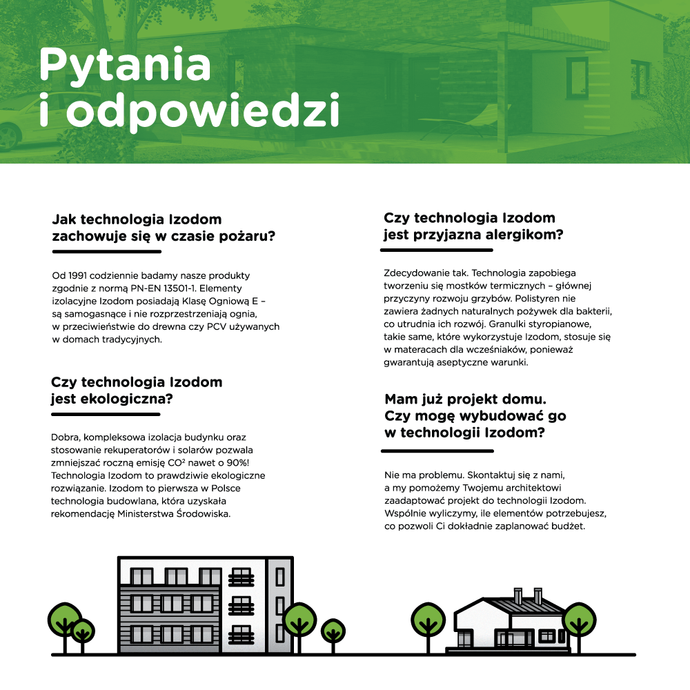 Firma Izodom 2000 Polska zajmuje się produkcją materiałów budowlanych przeznaczonych do budowy domów pasywnych i wysoce energooszczędnych, stanowiących kompletny system budowy domów w technologii Izodom 2000. Jest jedynym w Europie dostawcą kompletnej technologii budowy domów pasywnych. Domy wybudowane w technologii Izodom 2000 zaoszczędziły ponad 12,5 mln ton CO2 i 200.000 ton pyłów. Firma posiada 19.000 budynków referencyjnych w 43 krajach. Technologia Izodom opiera się na metodzie traconego szalunku, w której kształtki układa się jak klocki, a rdzeń wypełnia się betonem. W ofercie firmy znajdują się płyty fundamentowe, elementy ścienne, stropy oraz dachy. Klocki można łączyć ze sobą w dowolny sposób uzyskując określony kształt oraz wielkość domu. Budowa pozwala realizować budynki wyjątkowo szybko dzięki prostocie budowy przypominającej budowę z klocków LEGO.