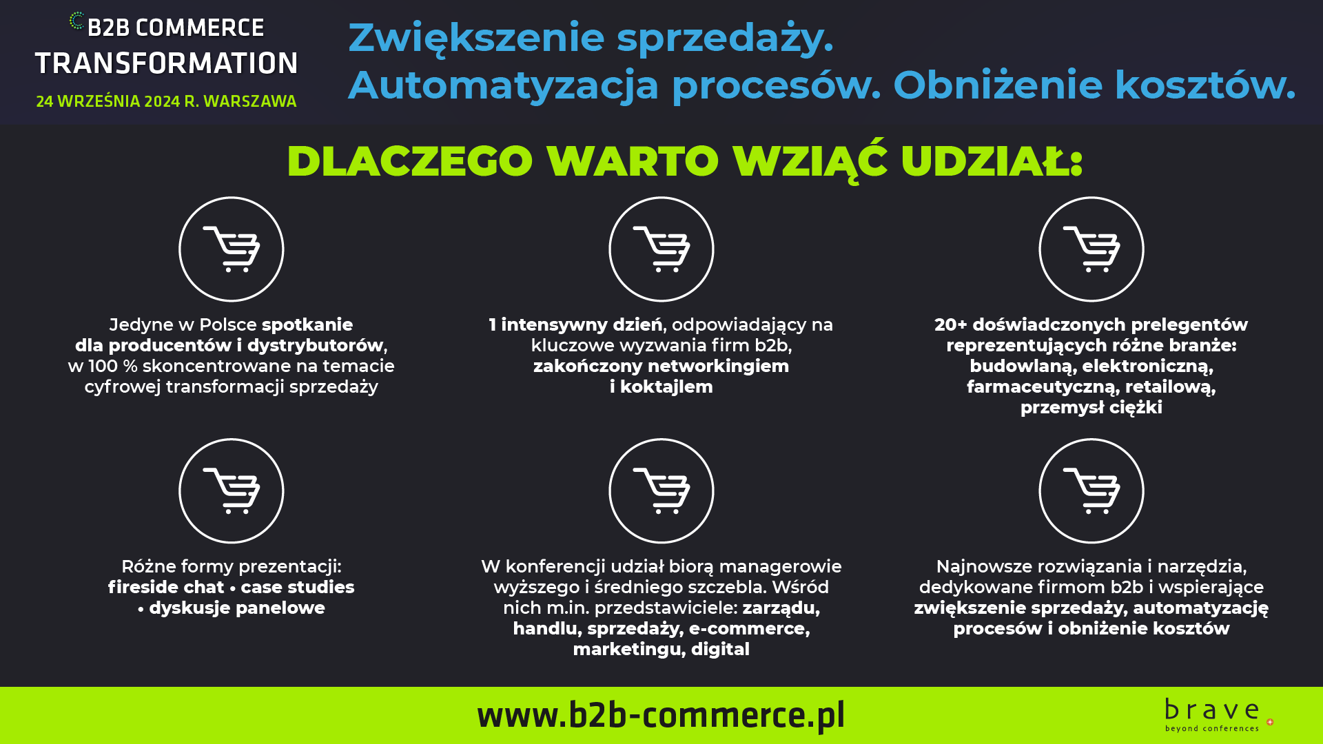 Transformacja cyfrowa i wdrożenie sprzedaży online to wyzwanie dla organizacji z wielu branż. 98 proc. firm poszukuje produktów dla swojego biznesu właśnie w internecie, a udostępnienie cyfrowych kanałów sprzedaży staje się wymogiem współczesnego rynku w relacjach biznesowych. Największe wyzwania dotyczące cyfrowej transformacji, jak też praktyczne rozwiązania i doświadczenia firm, które już ją wdrożyły będzie poświęcone premierowe Forum B2B COMMERCE TRANSFORMATION organizowane 24 września 2024 r. w Warszawie przez brave conferences.